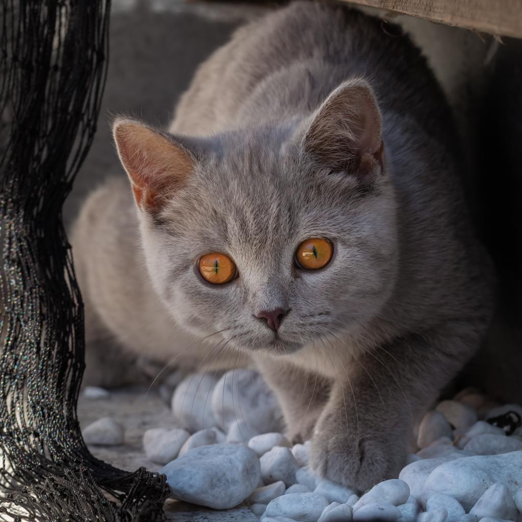 » Wallpaper A beautiful gray cat with yellow eyes walks on the stones
