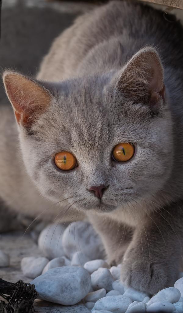 » Wallpaper A beautiful gray cat with yellow eyes walks on the stones