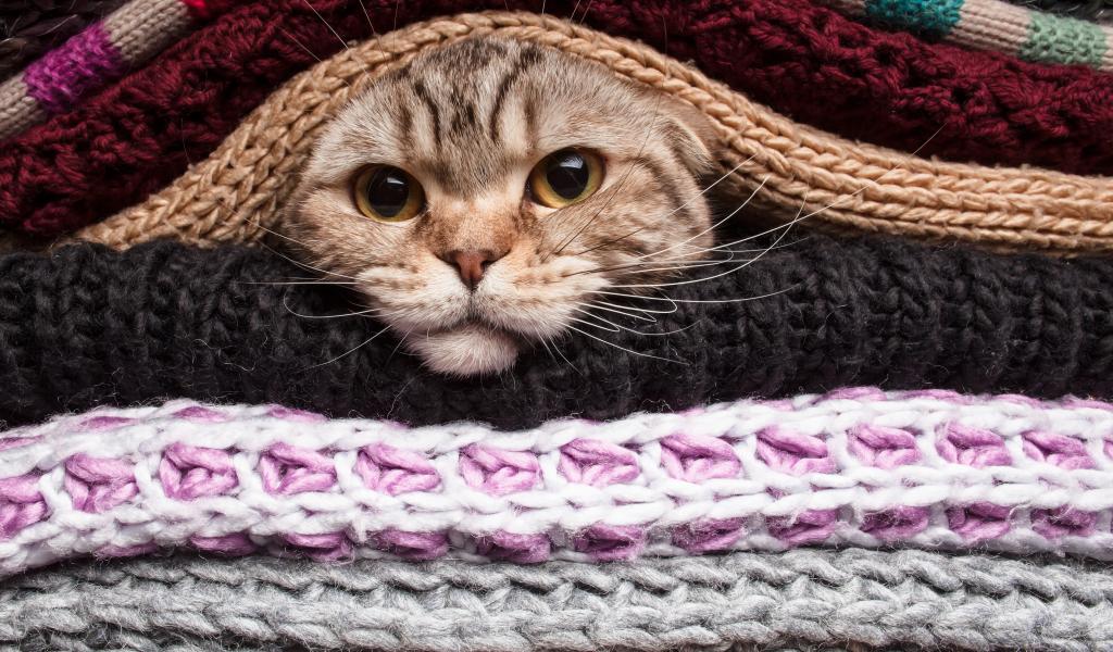 Wallpaper Gray cat is warming in blankets