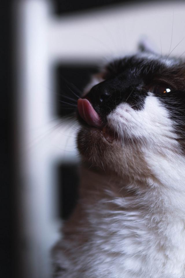 Wallpaper Black and white cat with protruding tongue