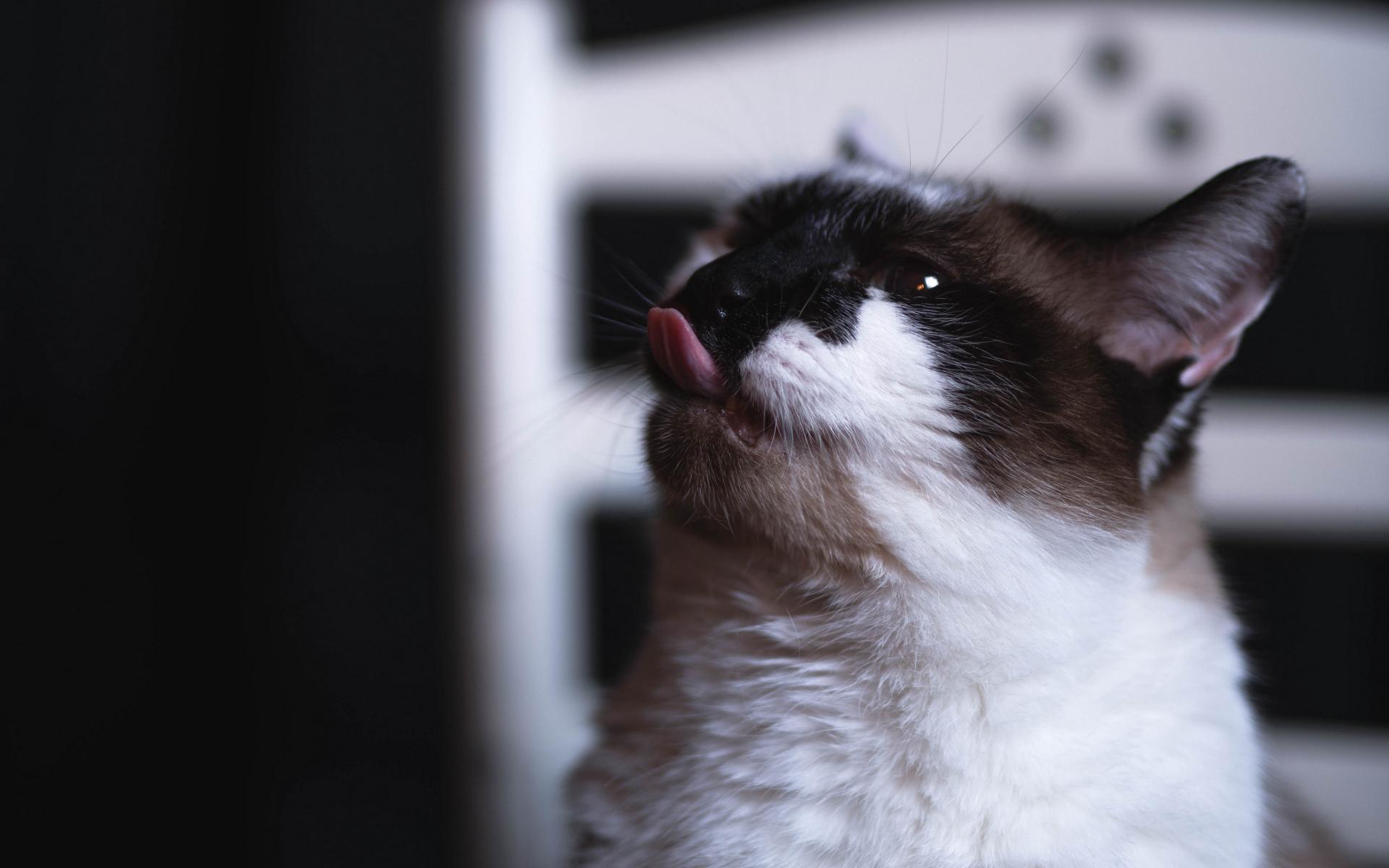 Wallpaper Black and white cat with protruding tongue