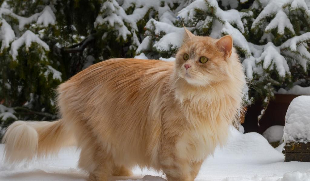 Wallpaper Beautiful fluffy red cat by a snowy fir