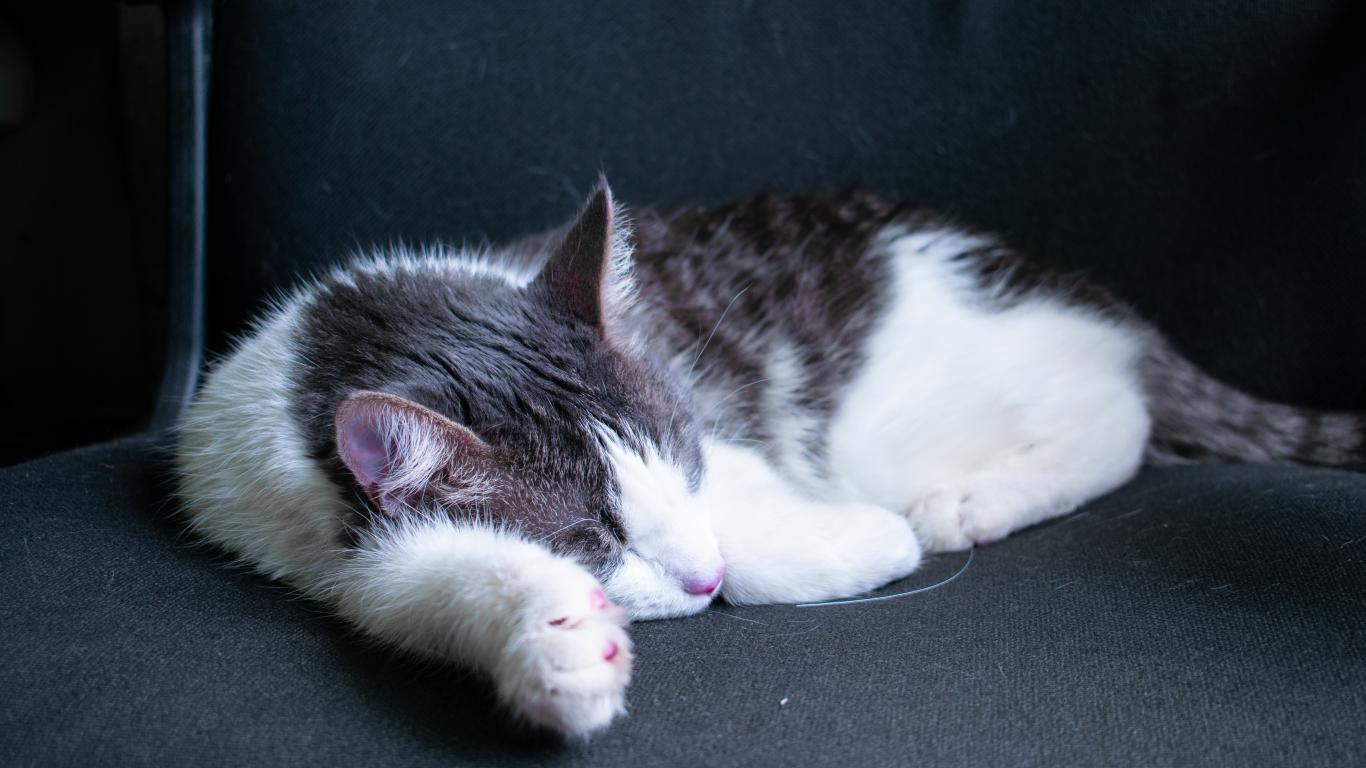 Wallpaper Sleeping white-gray cat on a black sofa