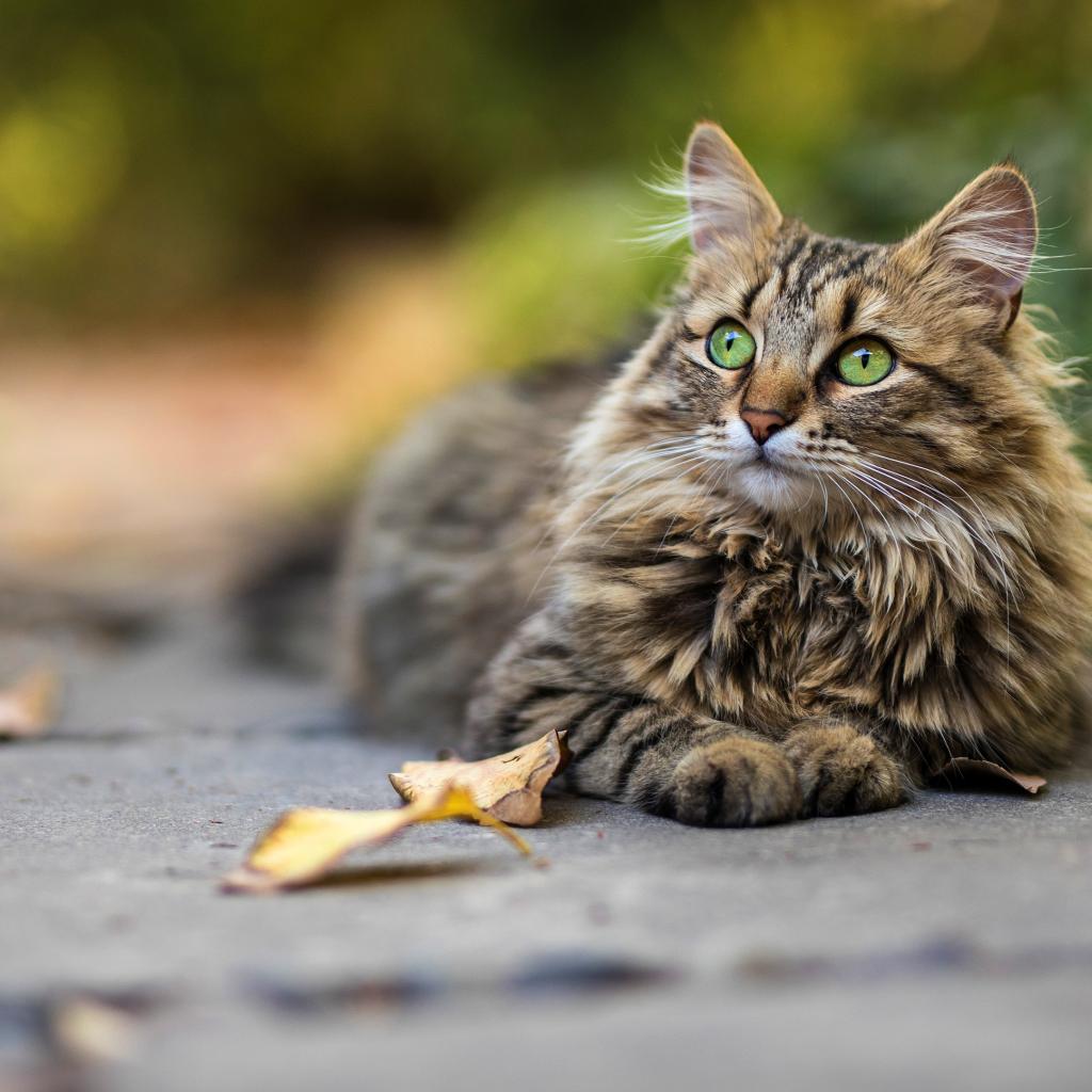 Wallpaper Beautiful fluffy green-eyed gray cat lies on the ground