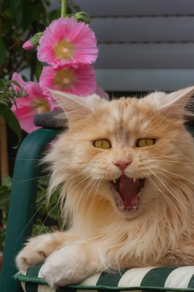 Wallpaper Fluffy ginger cat yawns in a chair