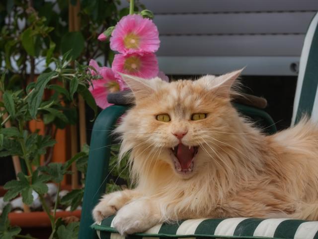 Wallpaper Fluffy ginger cat yawns in a chair