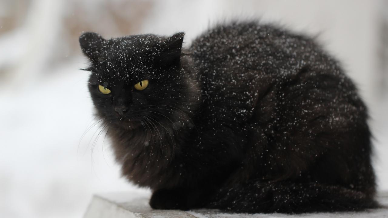 Wallpaper Displeased black cat in the snow on the street