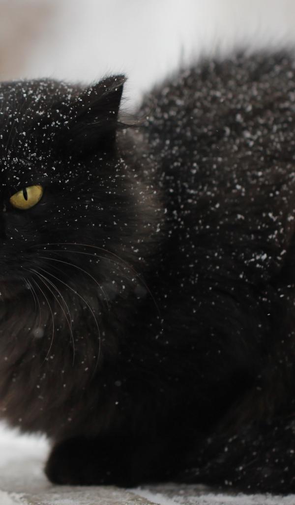 Wallpaper Displeased black cat in the snow on the street
