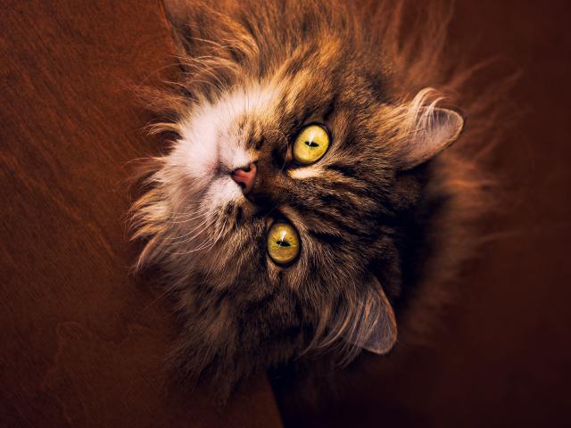 Wallpaper Fluffy gray cat with yellow eyes looks up