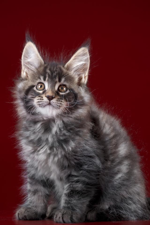 Wallpaper Fluffy gray Maine Coon kitten on a red background