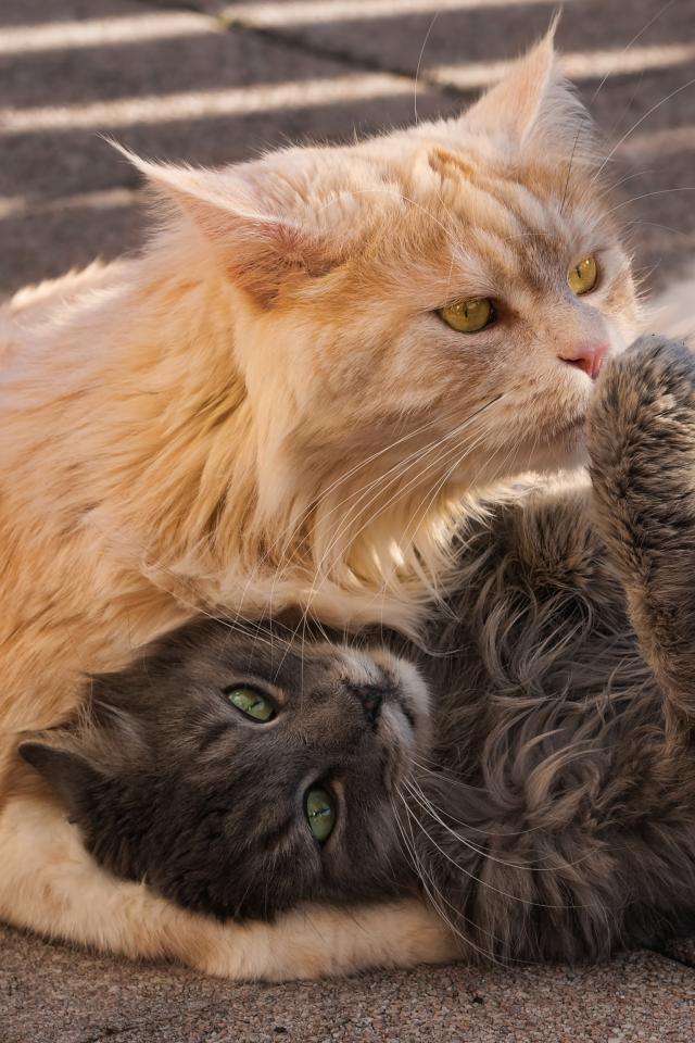 Wallpaper Gray and red fluffy cats lie on the ground.