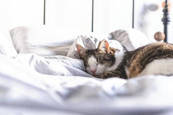 Wallpaper Domestic cat sleeps on a white bed