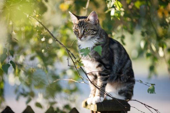 Wallpaper Big gray cat sits on a fence near a tree