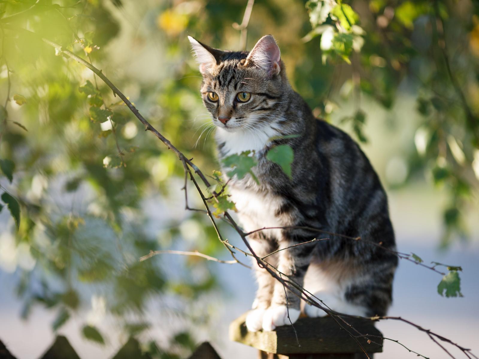 Wallpaper Big gray cat sits on a fence near a tree