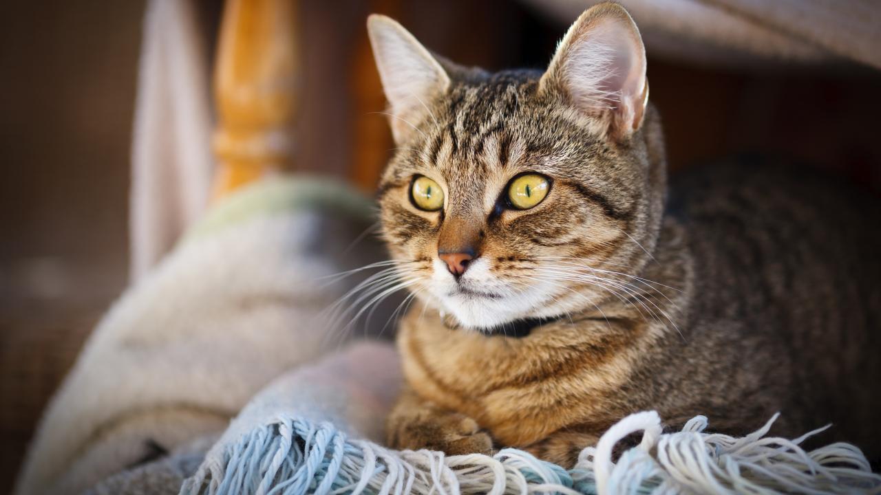 Wallpaper Beautiful gray cat with yellow eyes lies on a blanket