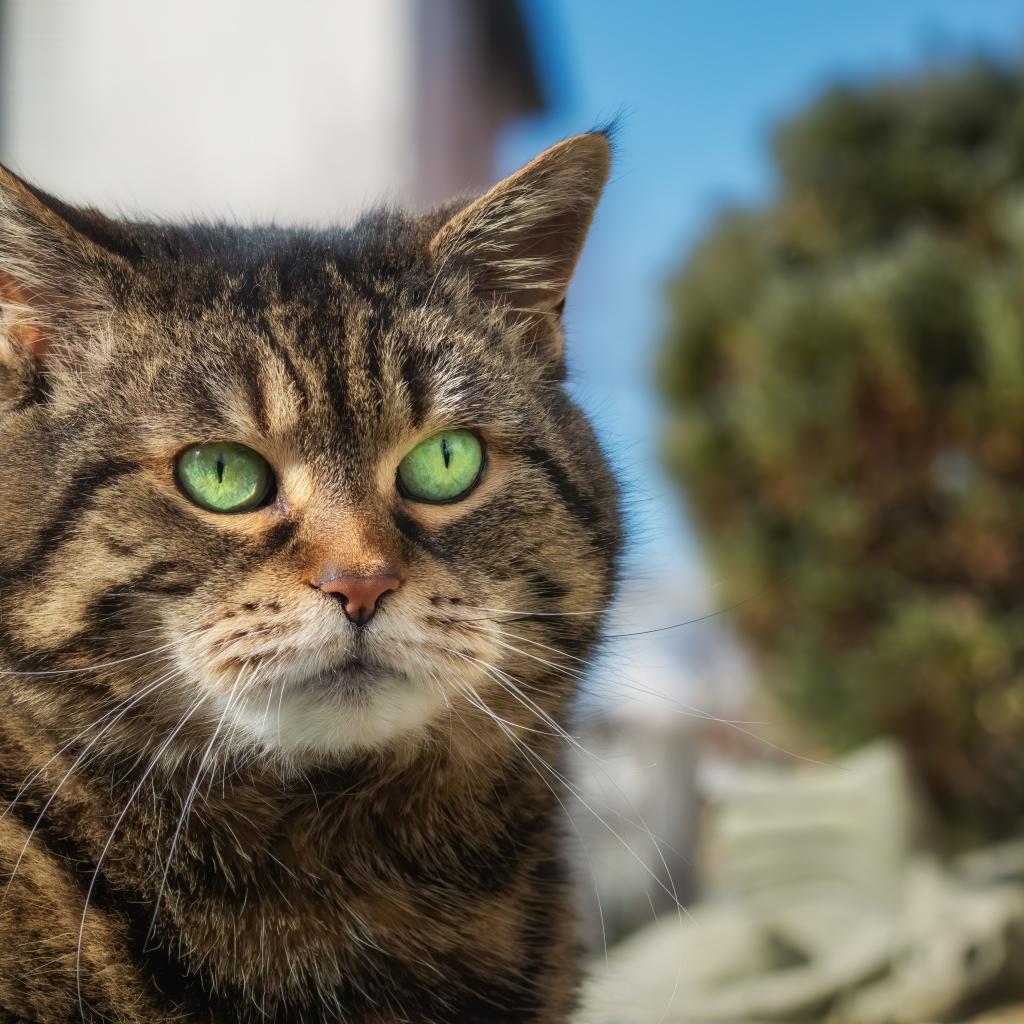 Wallpaper The face of a large gray cat with green eyes