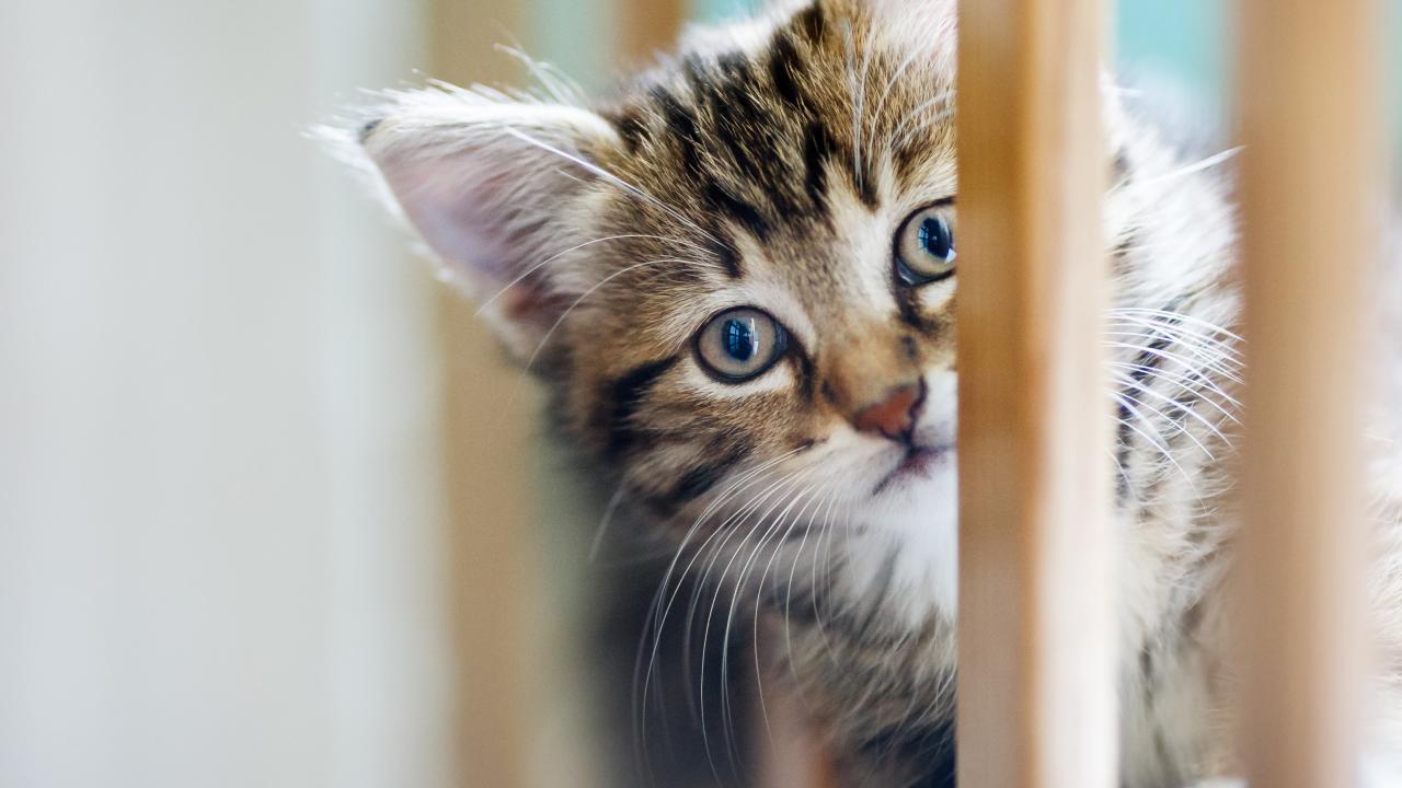 » Wallpaper Little gray kitten is playing