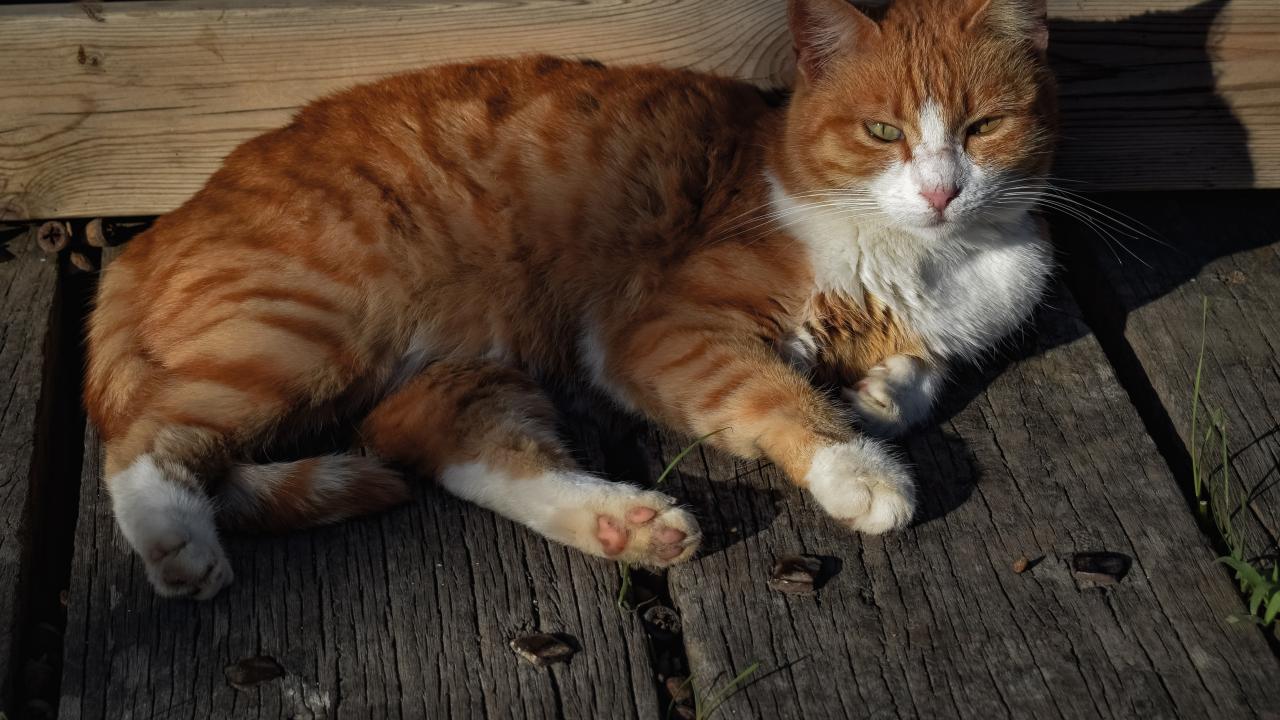 Wallpaper Red cat in the sun lies on the boards