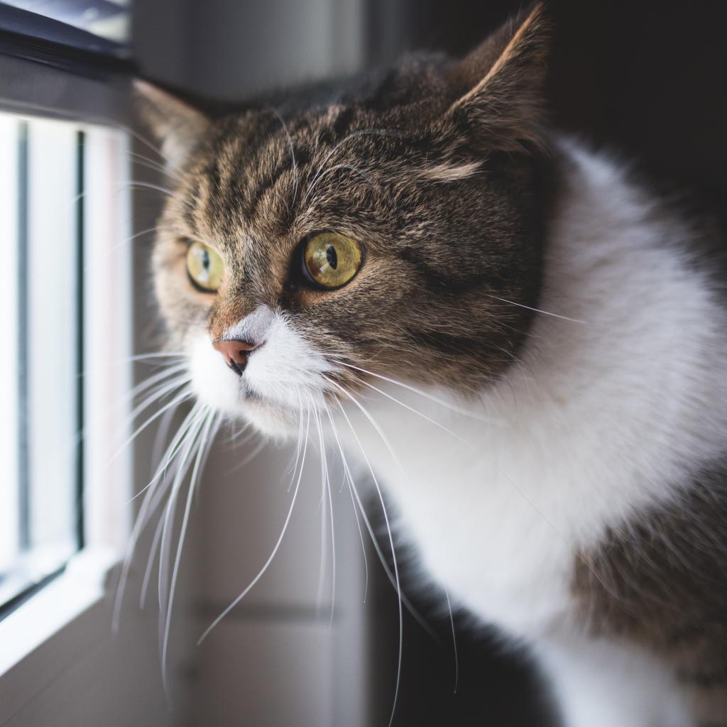 Wallpaper Big gray with white cat looks out the window