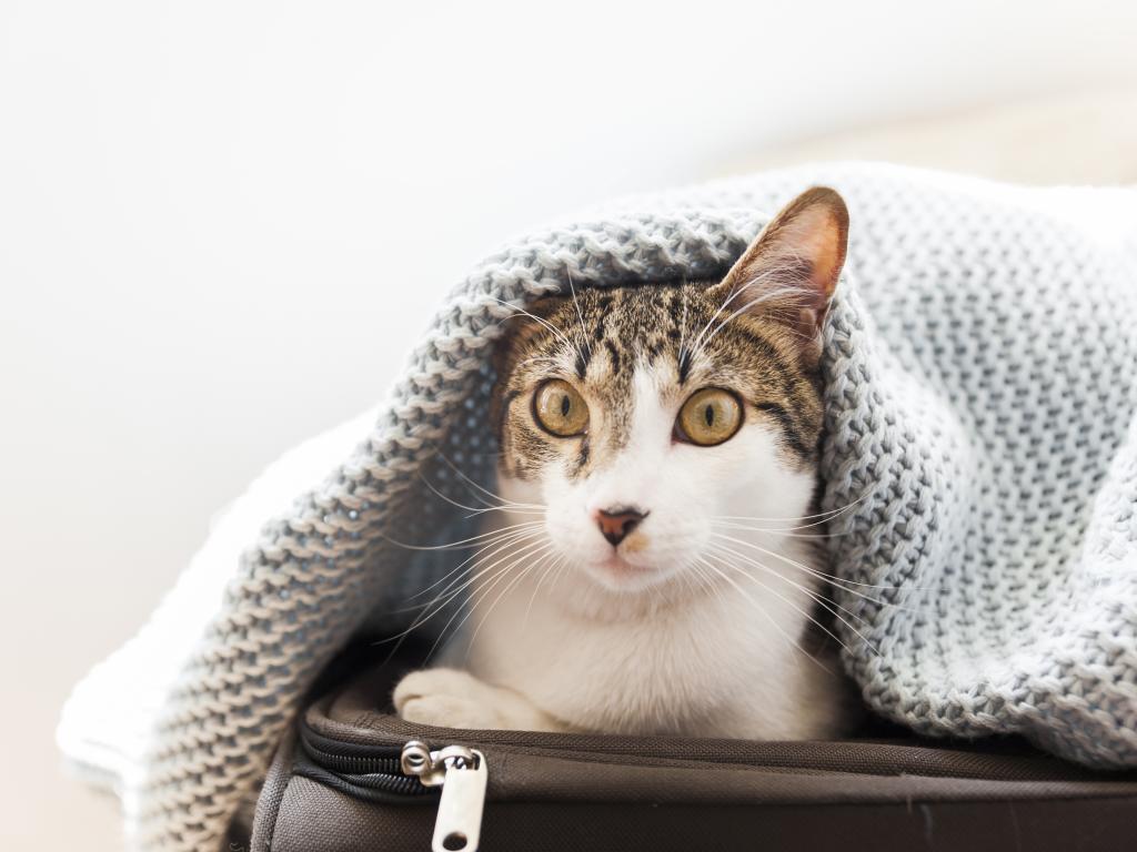 Wallpaper The cat is sitting on a suitcase under the covers.