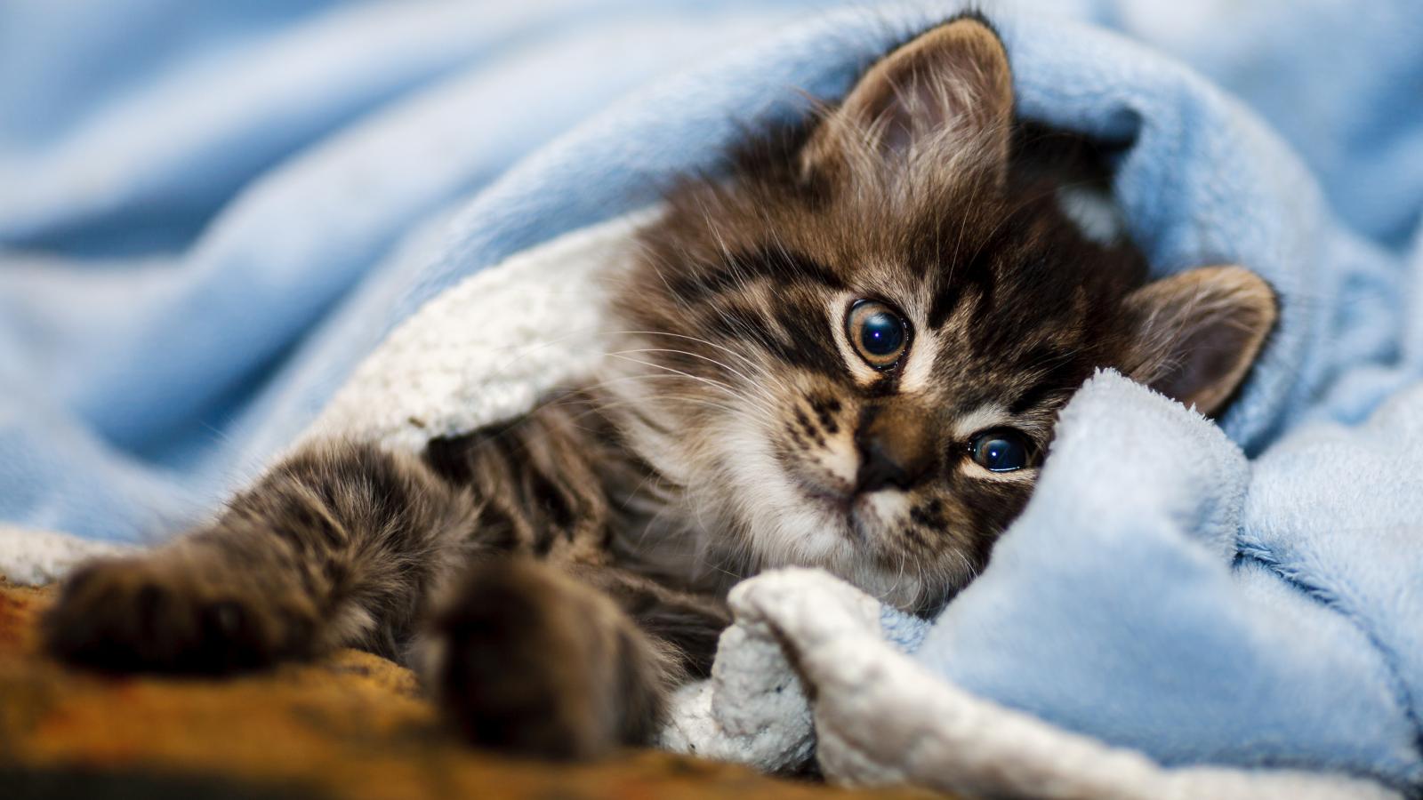 Wallpaper A purebred gray kitten lies under a blue blanket