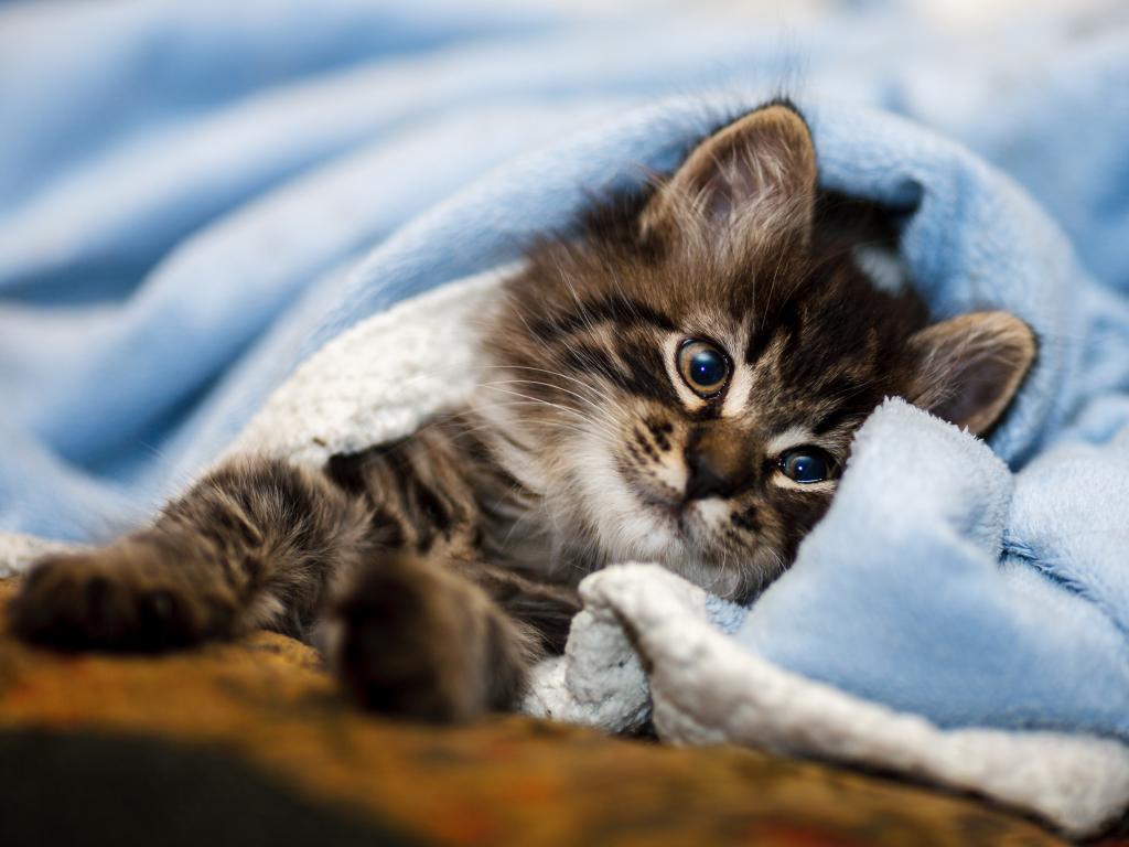 Wallpaper A purebred gray kitten lies under a blue blanket