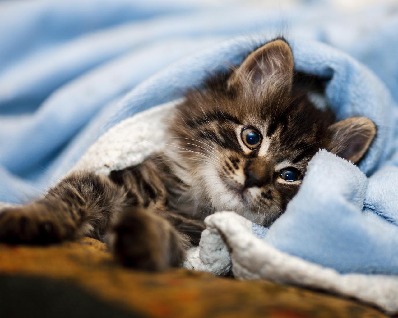 Wallpaper A purebred gray kitten lies under a blue blanket