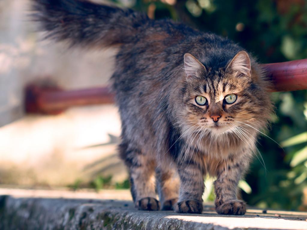 Wallpaper Fluffy gray cat with green eyes walks on the street.