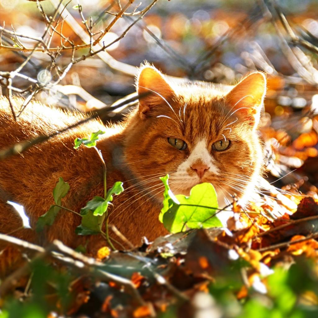 Wallpaper Beautiful ginger cat sits in foliage on a sunny day