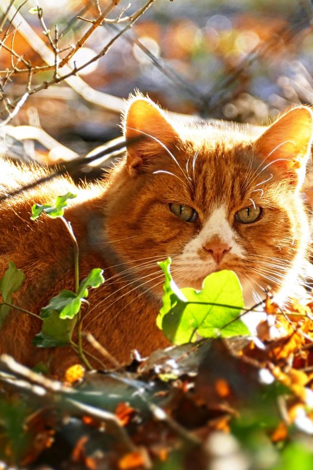 Wallpaper Beautiful ginger cat sits in foliage on a sunny day