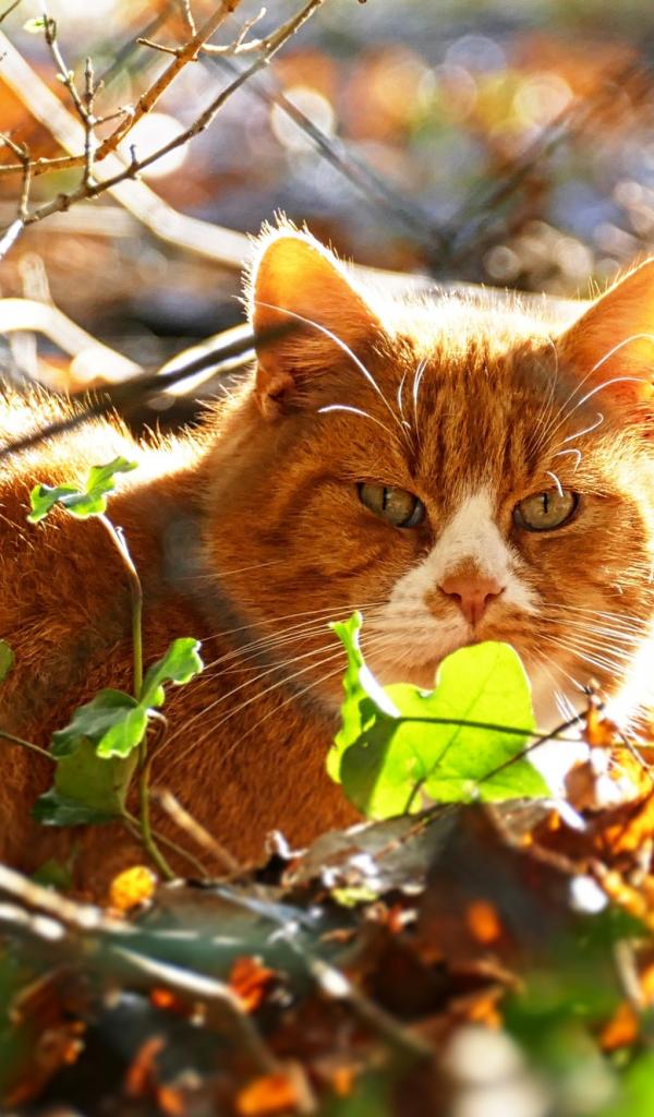 Wallpaper Beautiful ginger cat sits in foliage on a sunny day