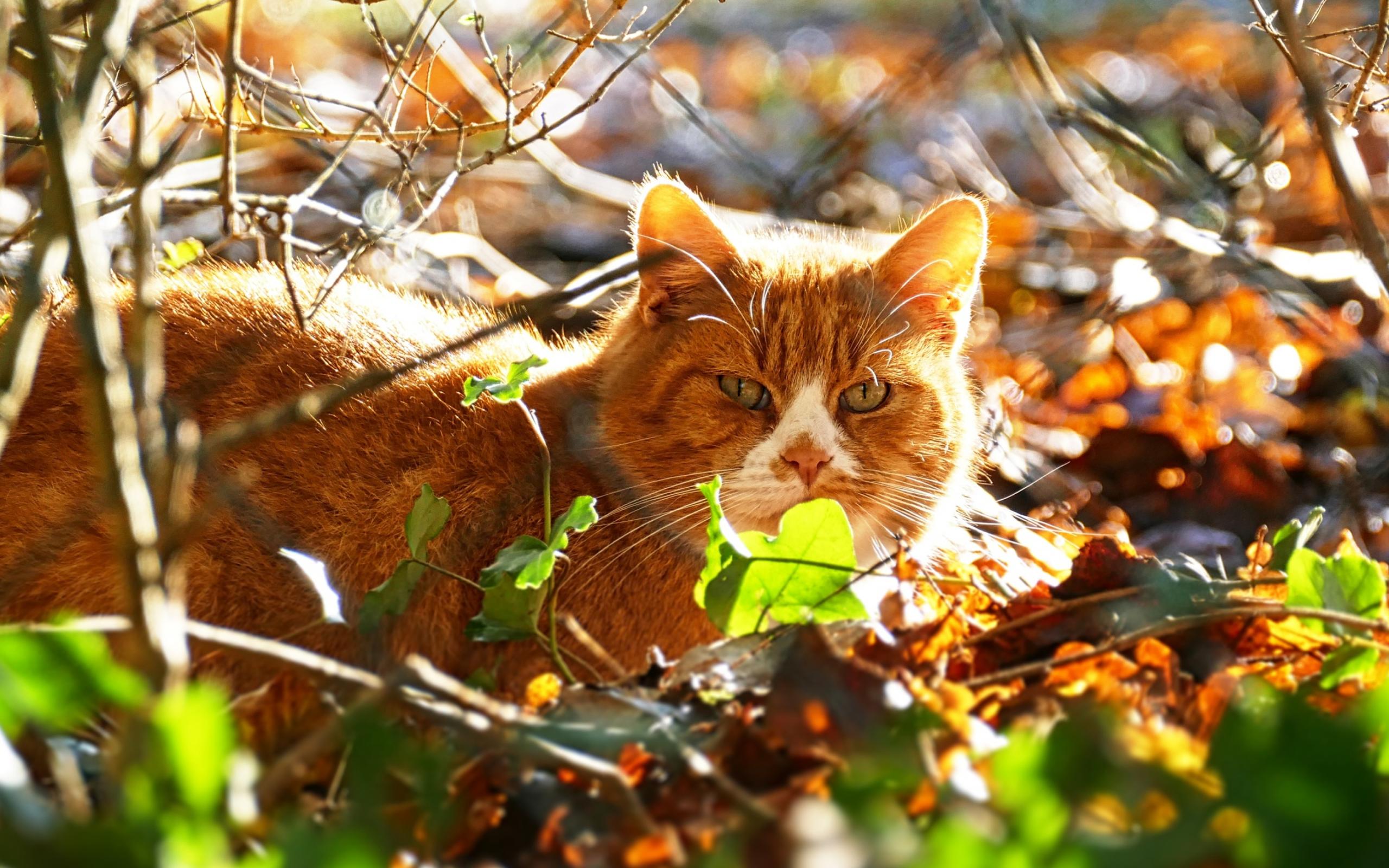 Wallpaper Beautiful ginger cat sits in foliage on a sunny day
