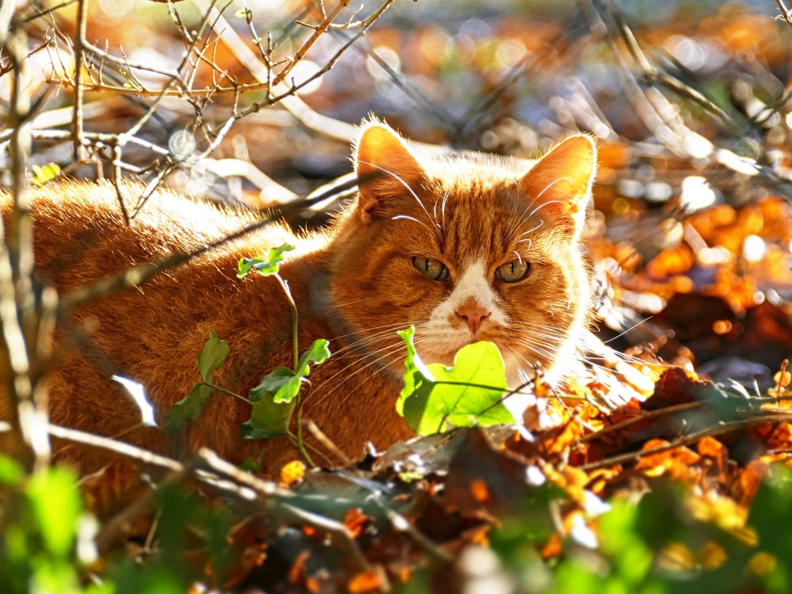 Wallpaper Beautiful ginger cat sits in foliage on a sunny day