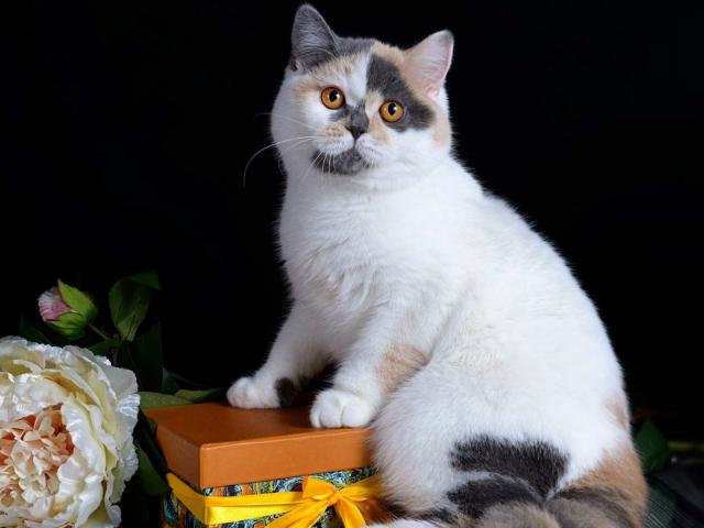 Wallpaper Beautiful kitten with a gift and a flower on a black background