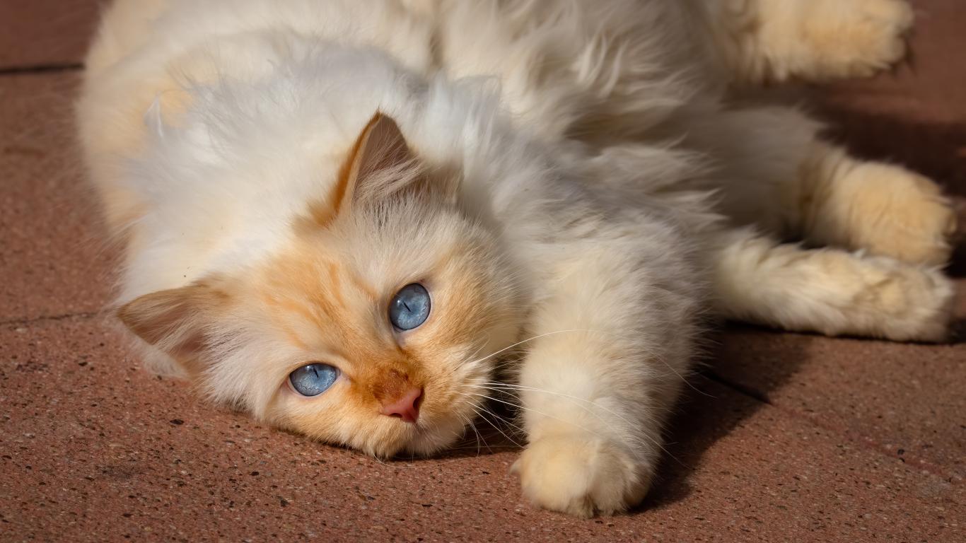 Wallpaper Beautiful blue-eyed thoroughbred cat lies on the floor