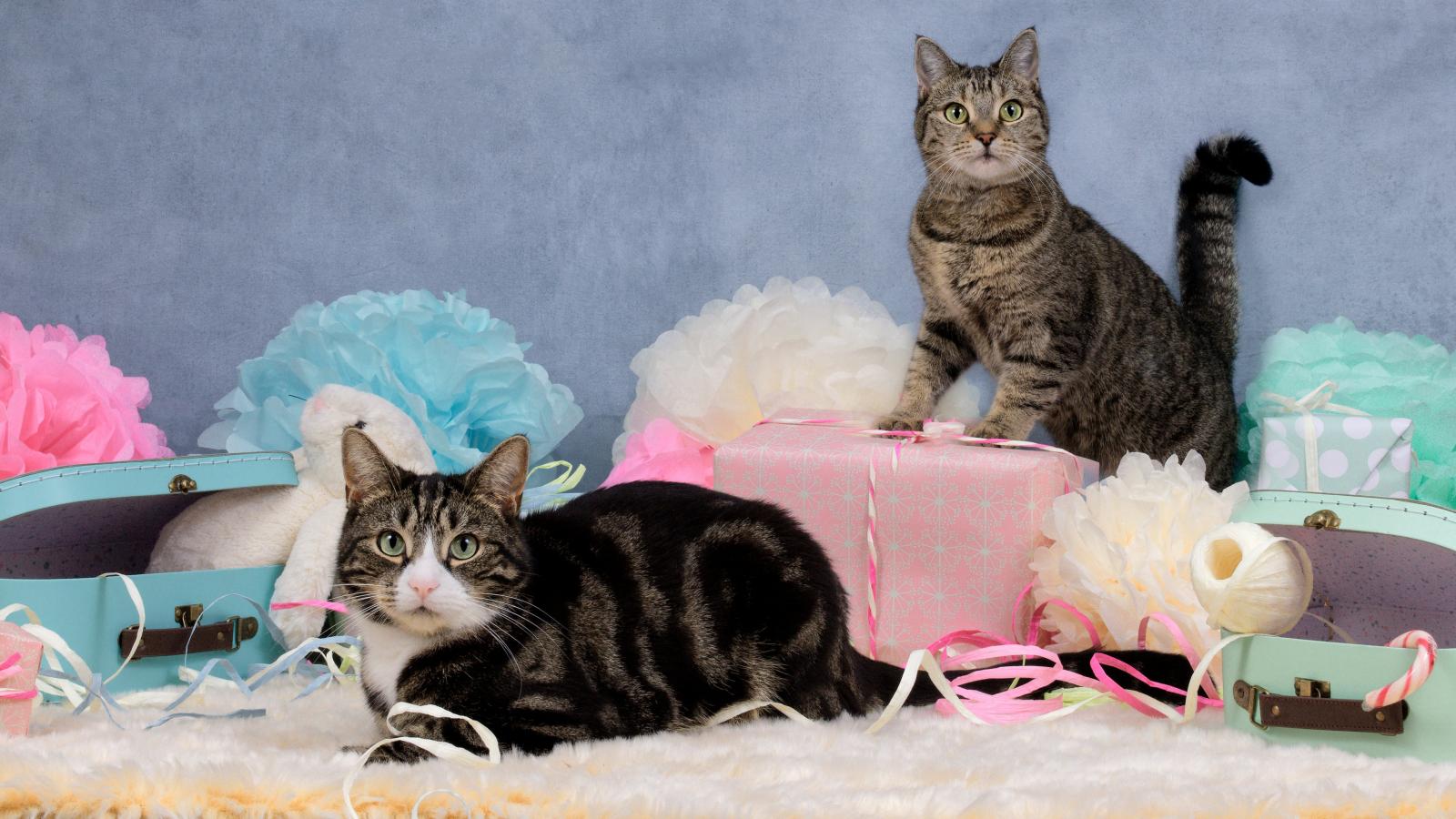 Wallpaper Two gray cats with gifts and flowers on a gray background