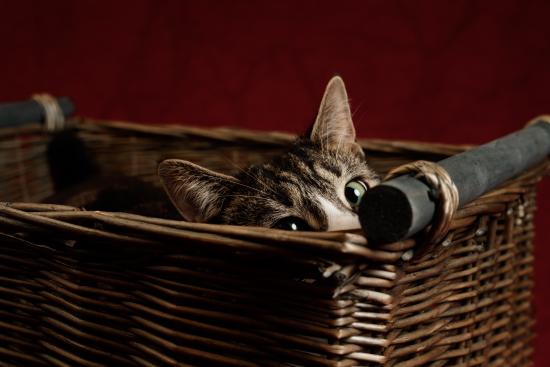 Wallpaper A gray cat with green eyes is hiding in a basket