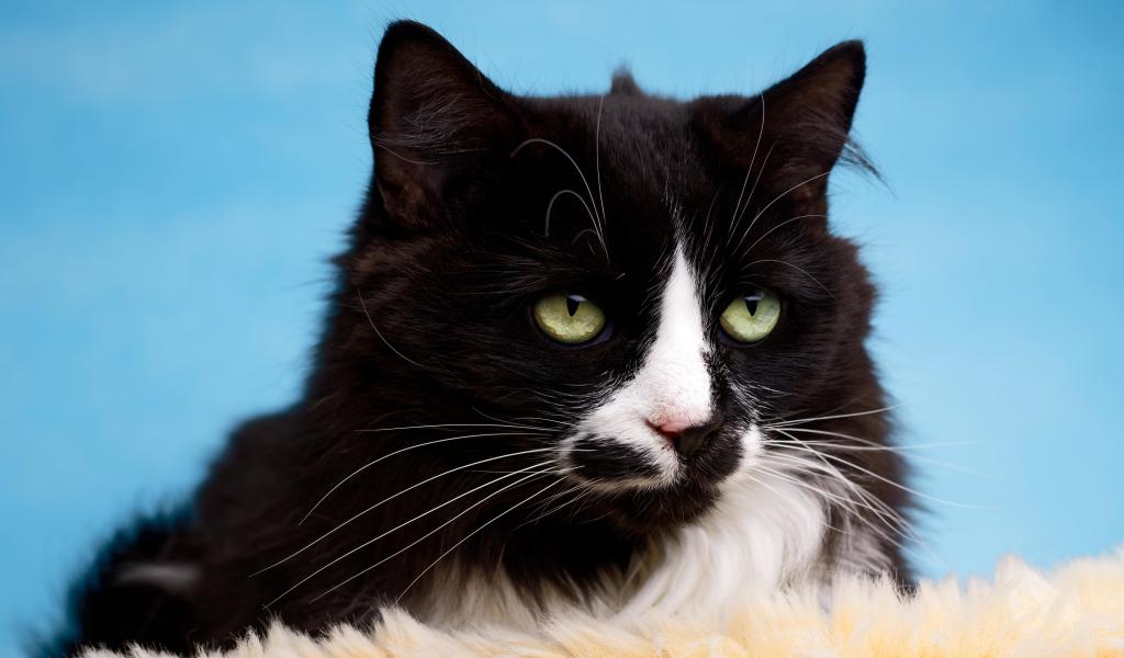 Wallpaper Black fluffy cat with white spots on a blue background