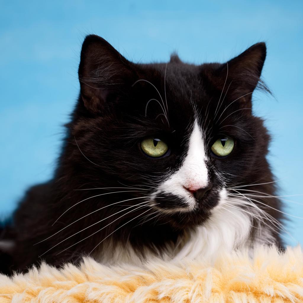 Wallpaper Black fluffy cat with white spots on a blue background