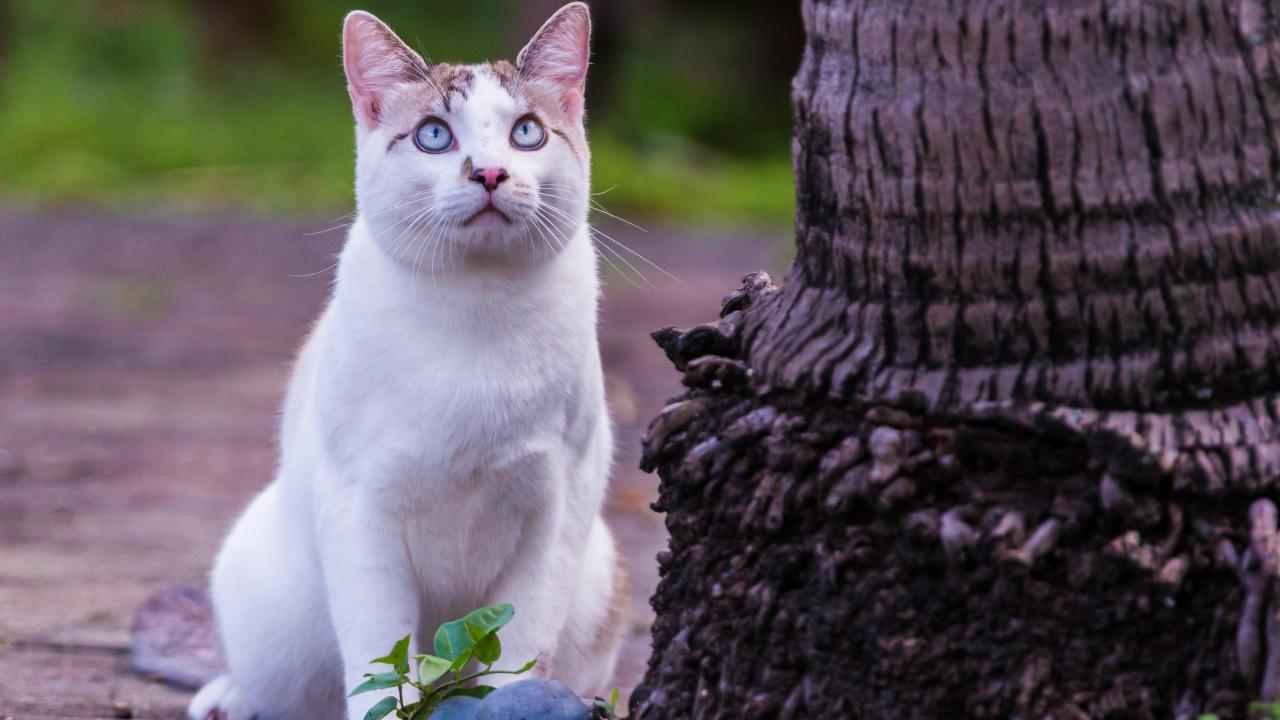 Wallpaper Beautiful white blue-eyed cat sits by a tree