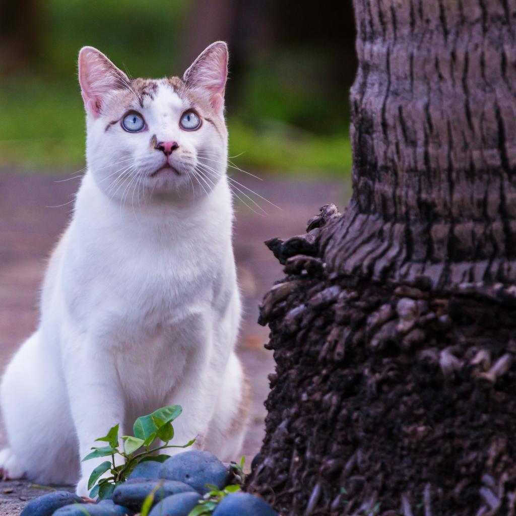Wallpaper Beautiful white blue-eyed cat sits by a tree
