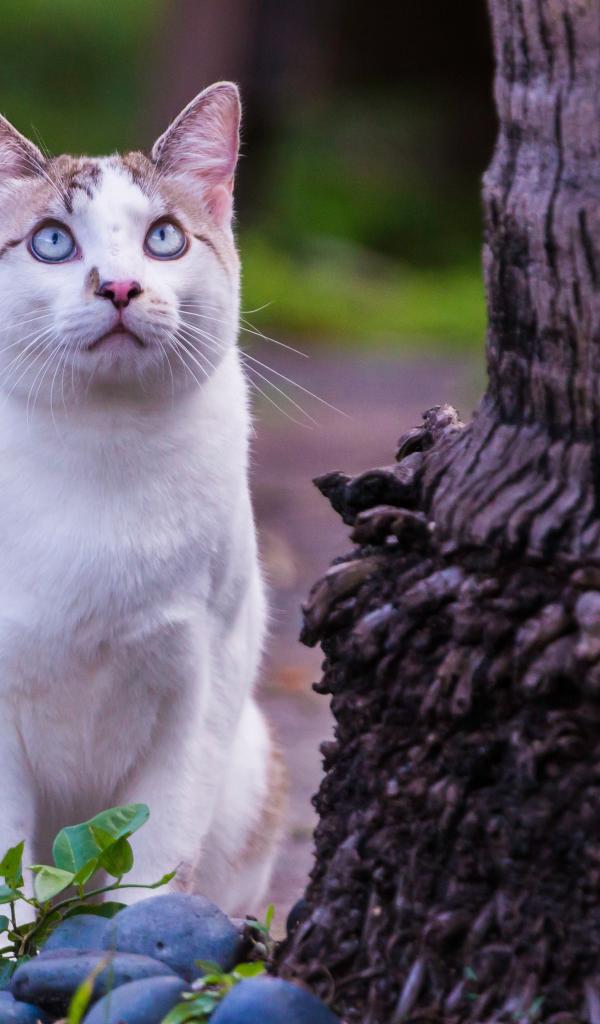 Wallpaper Beautiful white blue-eyed cat sits by a tree