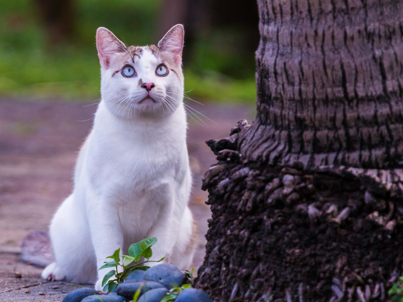 Wallpaper Beautiful white blue-eyed cat sits by a tree