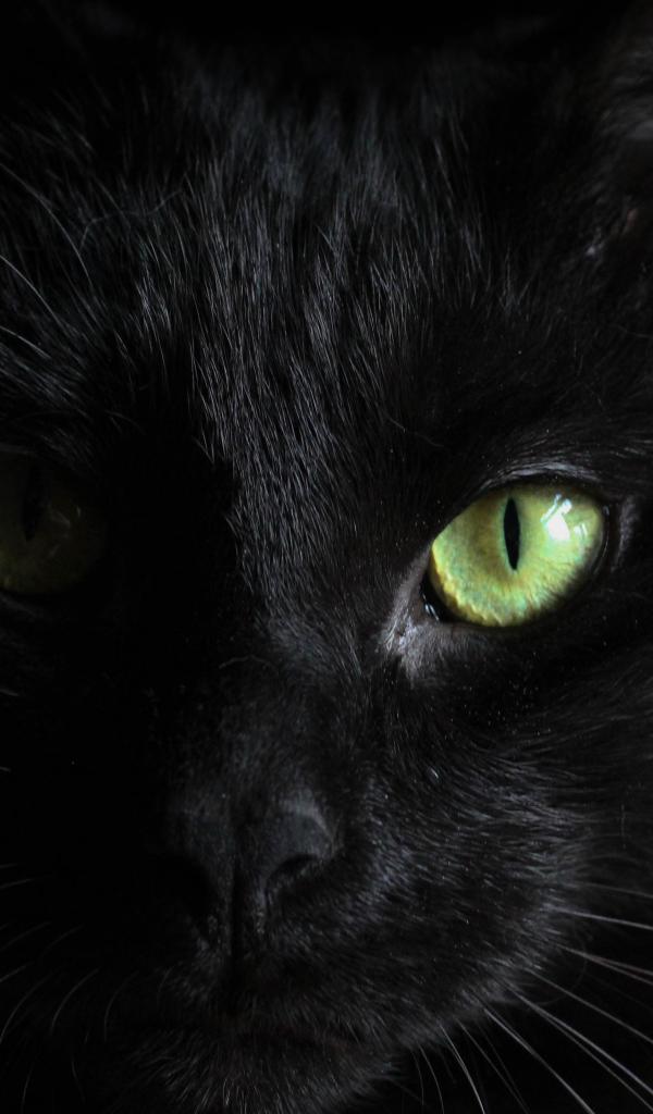 Wallpaper The face of a black cat with green eyes