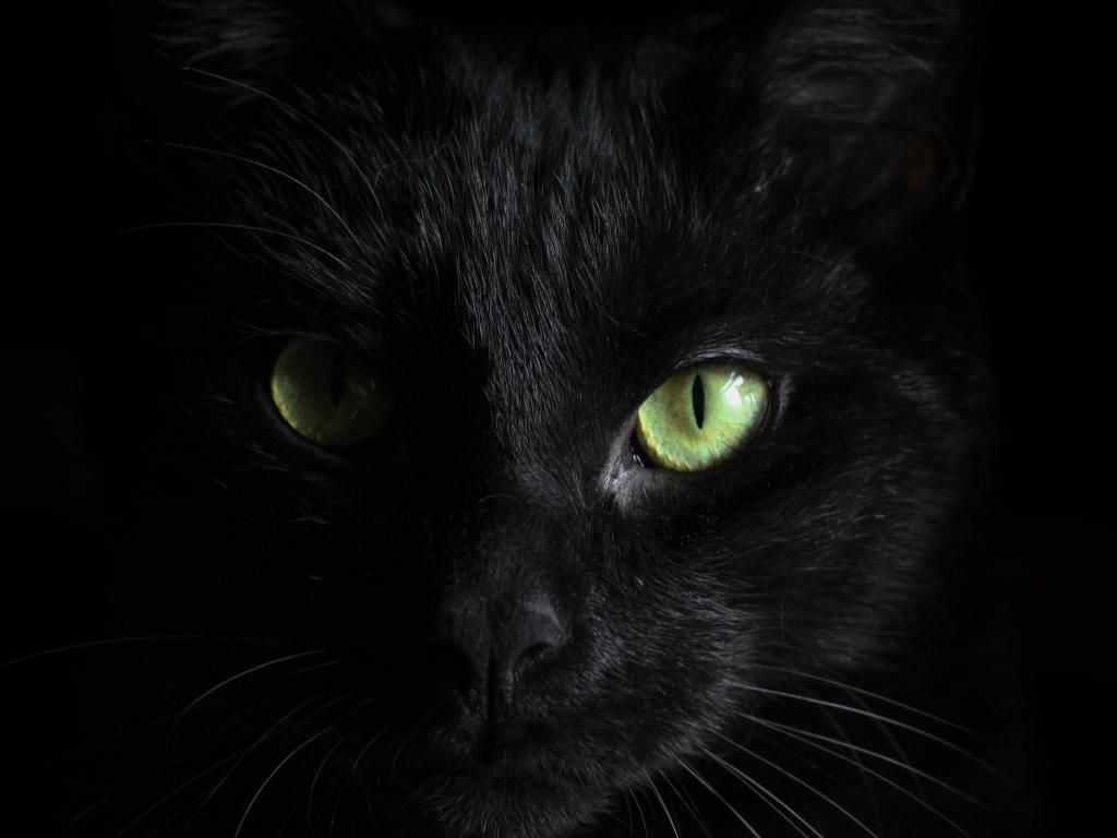Wallpaper The face of a black cat with green eyes