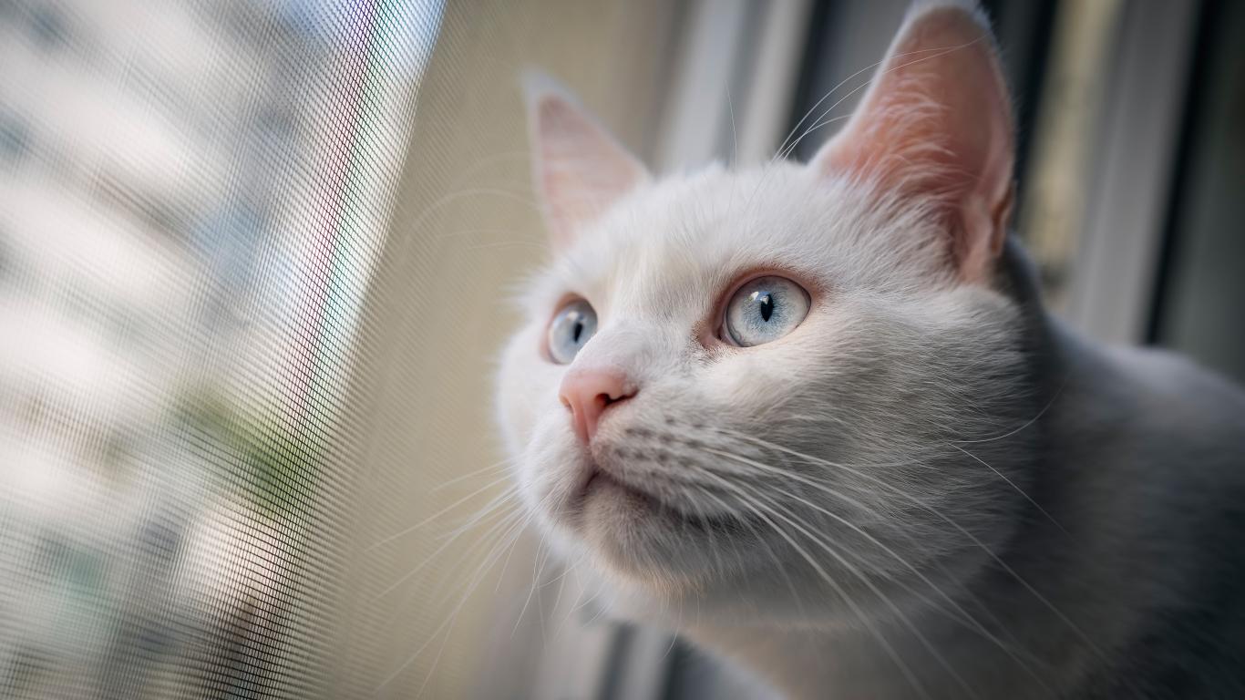 Wallpaper Curious white blue-eyed cat looks out the window