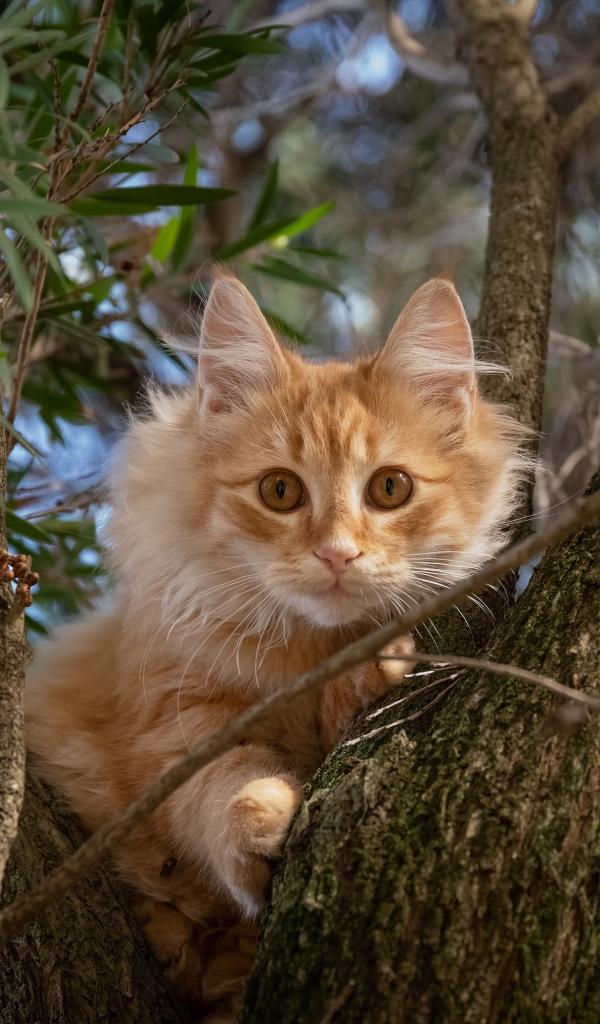 Wallpaper Curious gray kitten on a decorated Christmas tree