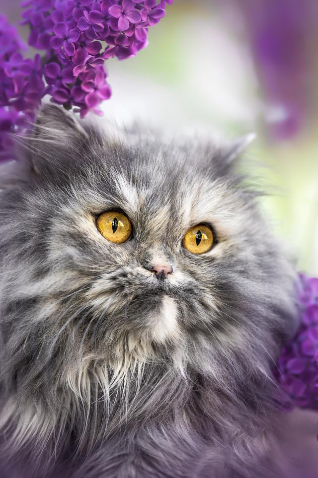 Wallpaper Fluffy gray cat with yellow eyes in lilac colors.