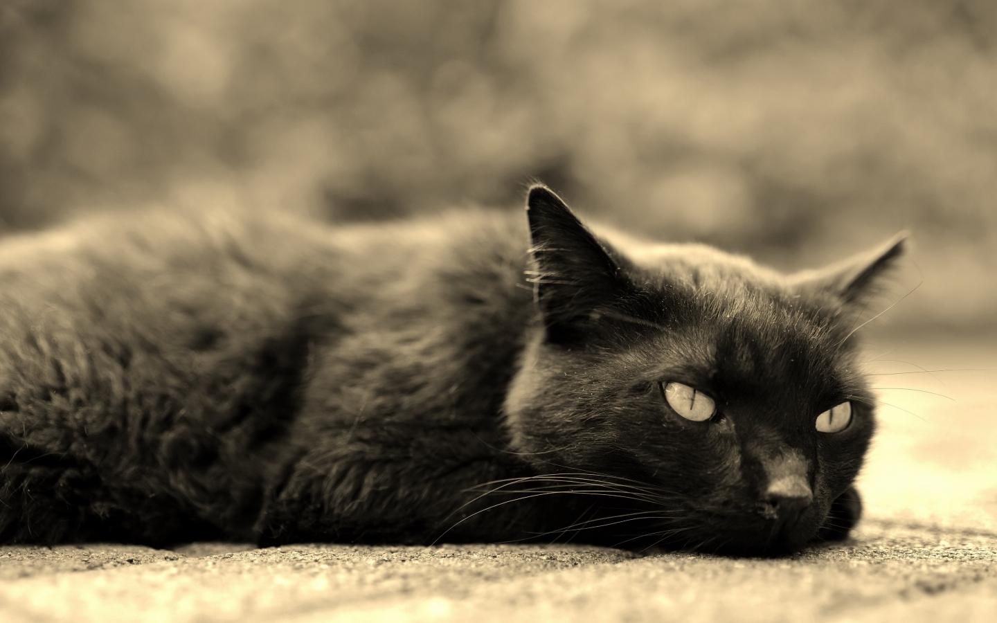 Wallpaper Black cat lies on the pavement