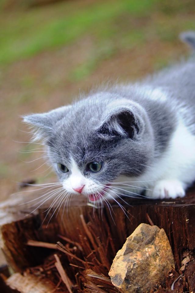 Wallpaper Little kitten screams on an old stump